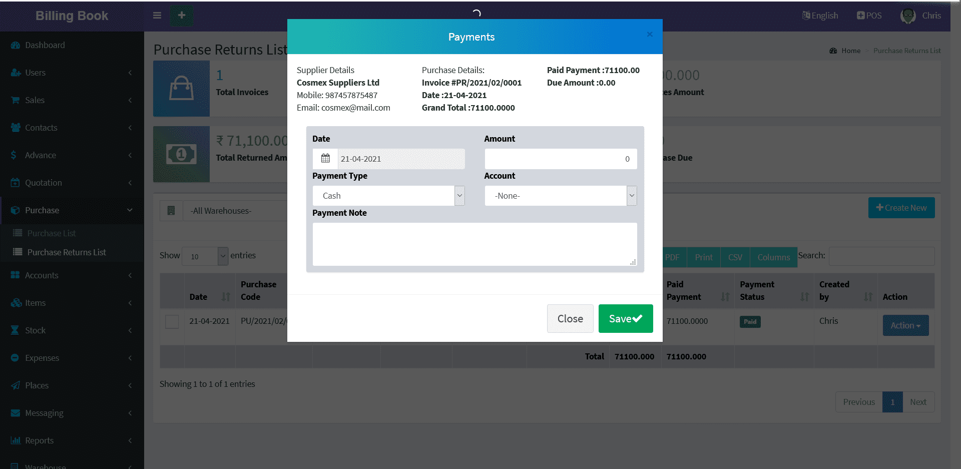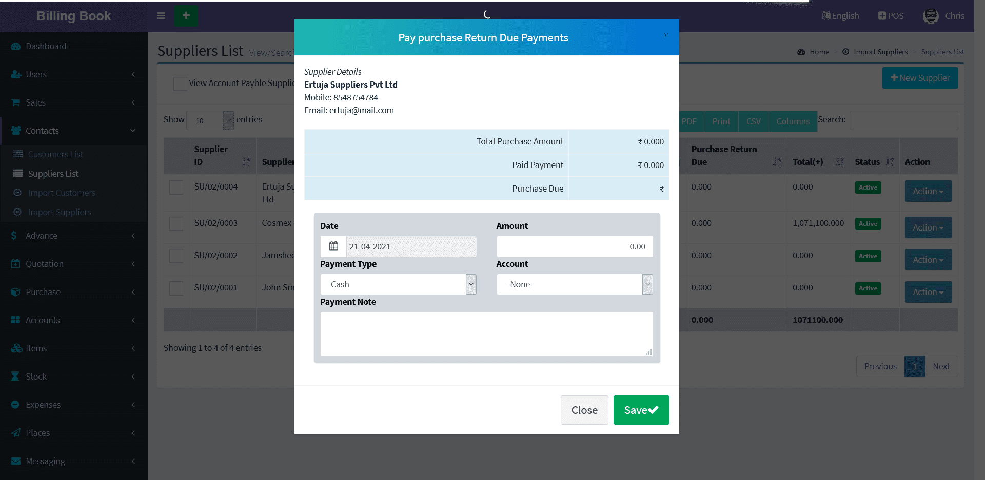 Suppliers -> Suppliers List -> Action Button -> Return Due Payments