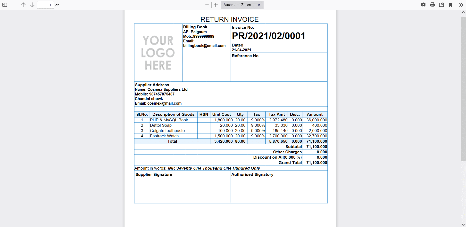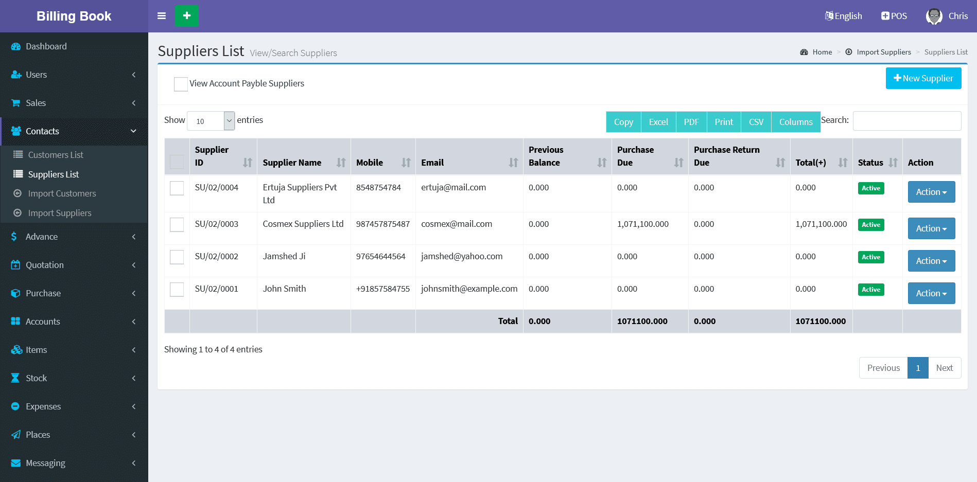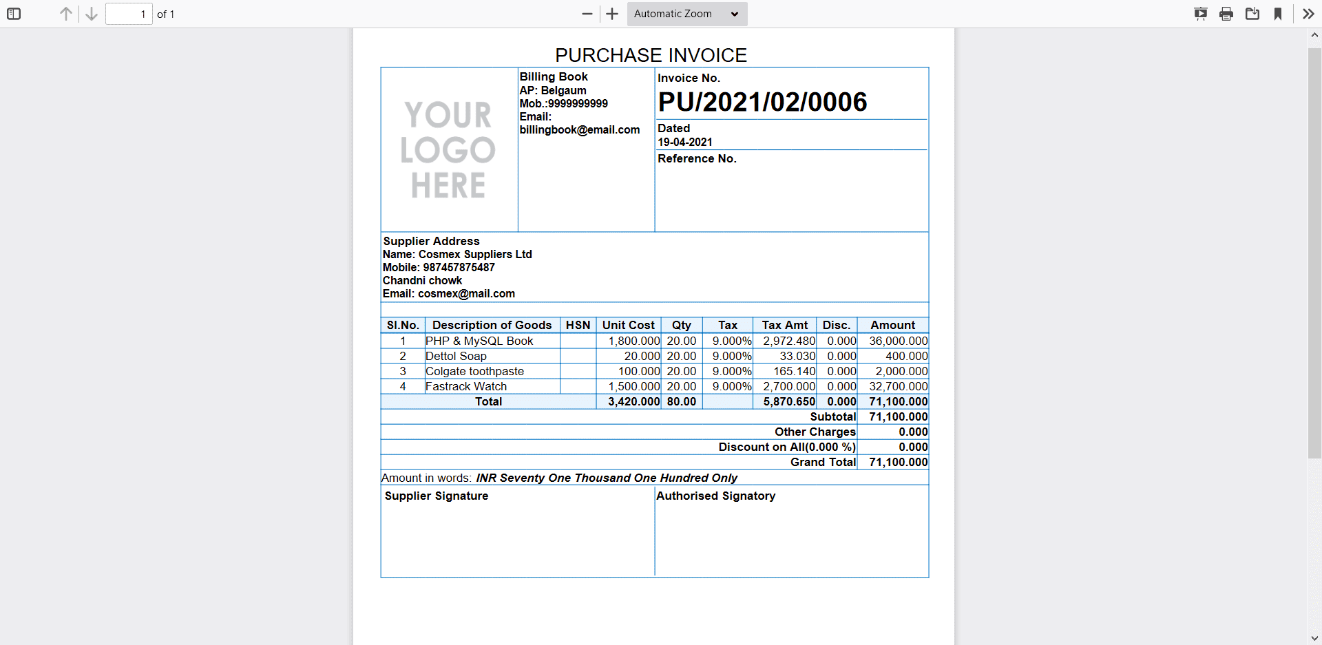 Billing Book is a PHP based web application software, where user can track and manage Items & Stock, Suppliers, Customers, Items Categories, Sales Invoice, Purchase Invoice, users and get all the reports which are require to your office with many more features. You can create any number of Warehouses and Users.